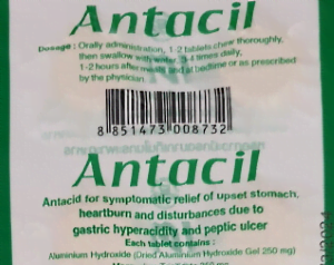 - ALUMINIUM HYDROXIDE – trade names: Algycon, Amogin, Belcid, Gaviscon, Herogel. The cheapest one is Antacil pills, only 20 baht for a blister pack.