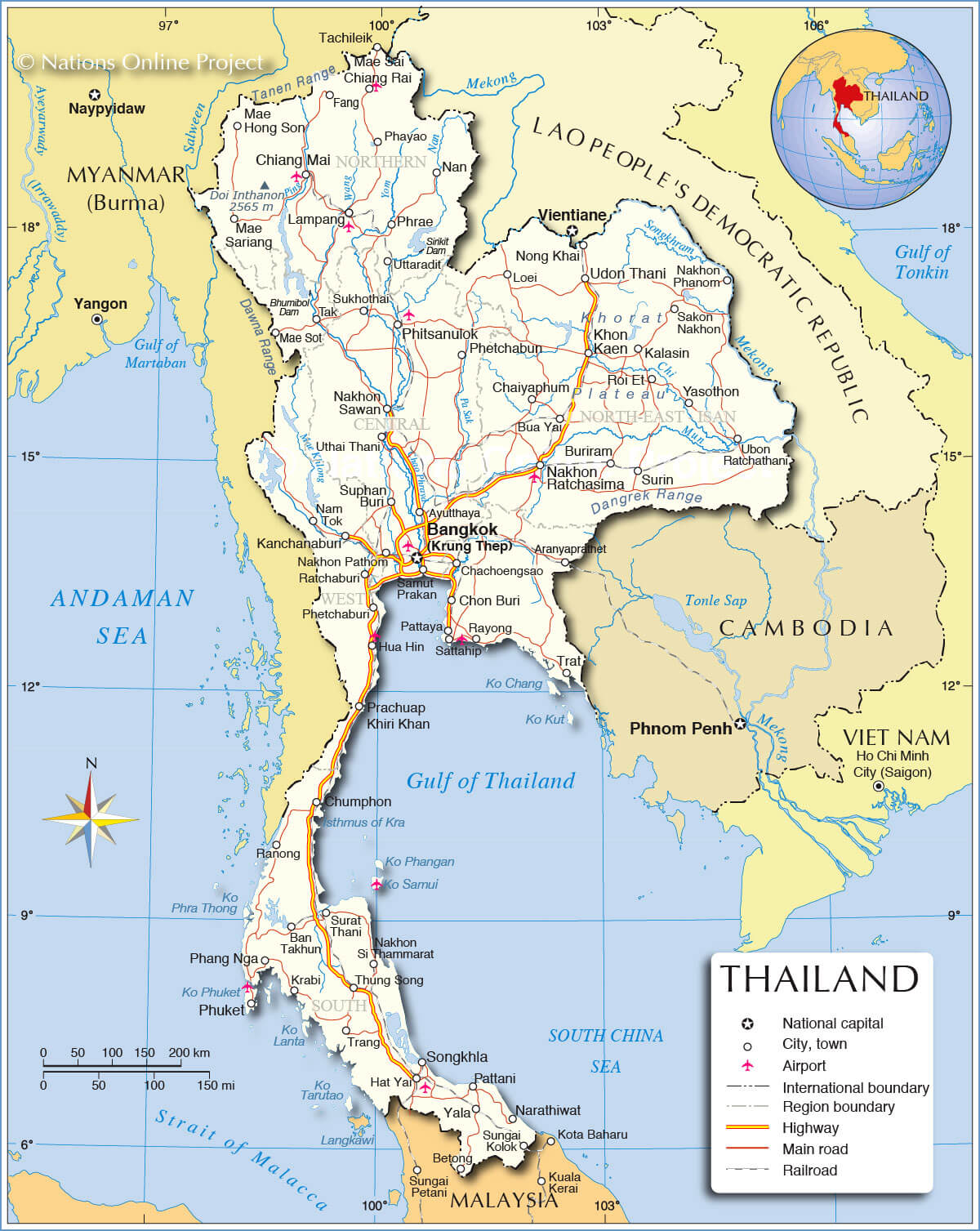 Here’s the map of Thailand and the surrounding countries with international borders, the regions of Thailand, the national capital Bangkok, major cities, expressways, and major airports.