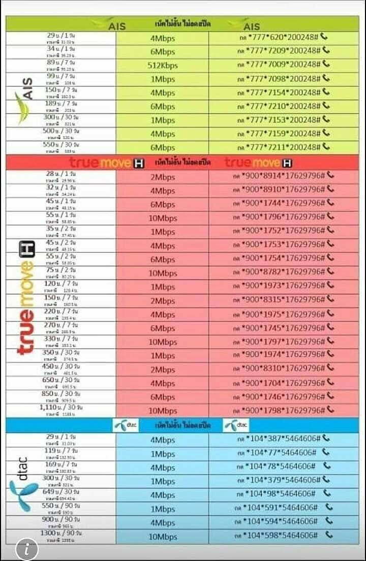 The list of commands for unlimited internet for all Thai mobile operators.